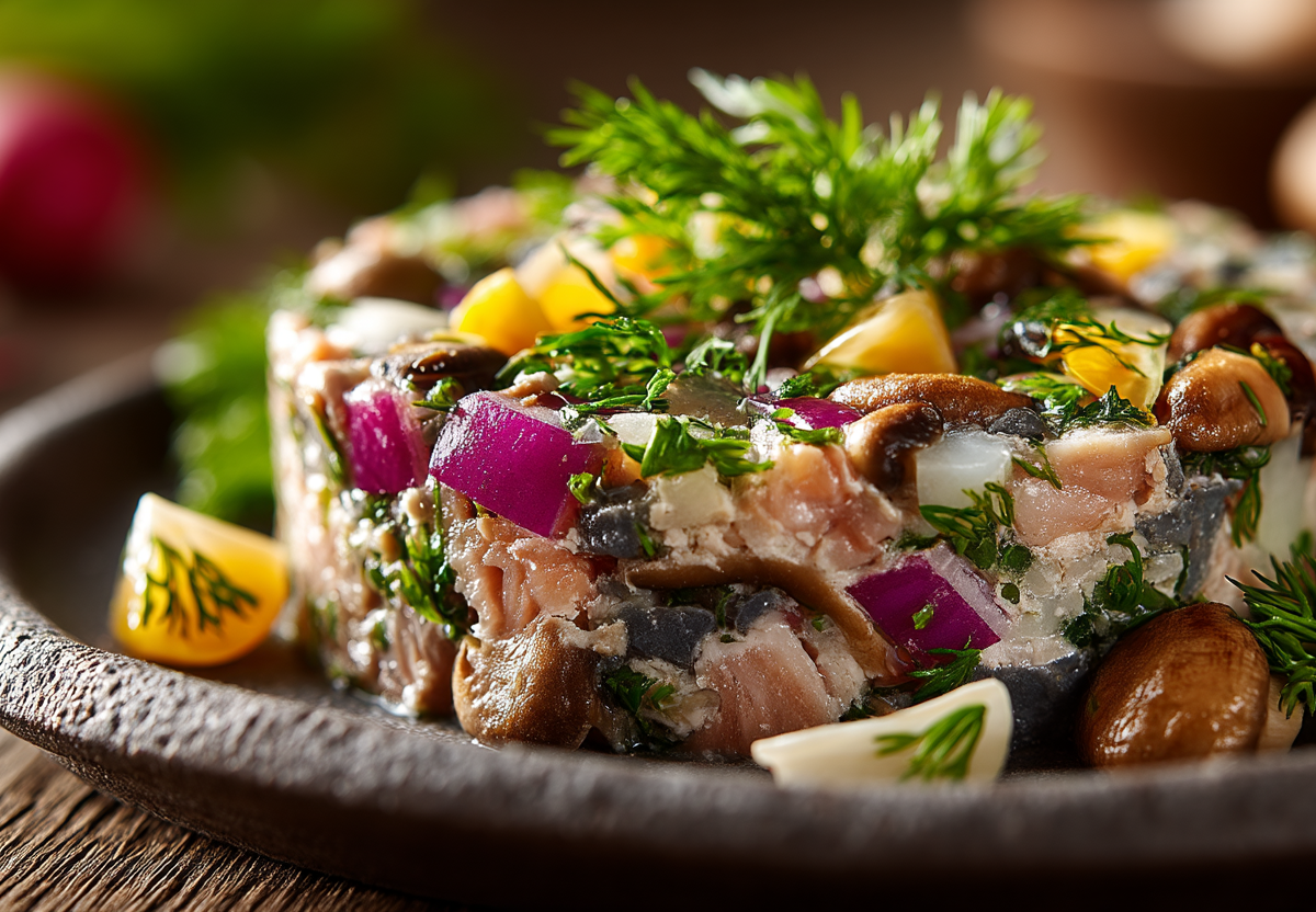 Если классический форшмак с яблоком кажется вам слишком привычным, эта версия станет открытием. Маринованные грибы придают блюду приятную кислинку и упругую текстуру, делая его более интересным и насыщенным.