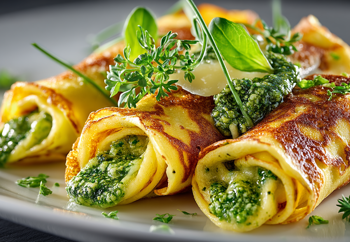 Твердый сыр натираем или крошим, мягкий — просто намазываем. Каждый омлетный пласт слегка смазываем песто, посыпаем или смазываем сыром и сворачиваем в плотный рулет или конвертик. Подаем с ломтиками свежего багета и дополнительным сливочным маслом.