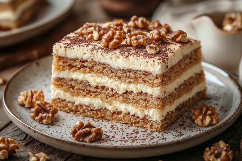 Грецкие орехи (100 г) слегка обжариваю на сухой сковороде, остужаю и крупно рублю. Мягкое сливочное масло (180 г) взбиваю миксером 3-4 минуты до белого пушистого состояния. Не прекращая взбивать, постепенно добавляю всю банку вареной сгущенки. Взбиваю еще 5–7 минут до однородного гладкого крема. Холодные сливки 33% (200 мл) взбиваю в отдельной чаше до устойчивых пиков. Аккуратно лопаткой вмешиваю взбитые сливки в масляно-сгусточный крем. Собираю торт: на блюдо кладу вафельный корж. Наношу тонкий слой крема (около 0,5 см), разравниваю и посыпаю частью орехов. Накрываю следующим коржом. Повторяю слои, пока не закончатся коржи. Верхний корж и бока обильно смазываю оставшимся кремом. Украшаю торчащими орехами. Накрываю торт пищевой пленкой и убираю в холодильник минимум на 4 часа, а лучше на ночь.