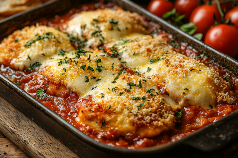 Обжариваю курицу на 2 ст. л. оливкового масла до золотистой корочки по 4–5 минут с каждой стороны. Для соуса измельчаю 2 зубчика чеснока и 350 г помидоров в собственном соку. В оставшемся масле обжариваю чеснок 1 минуту, добавляю помидоры, 1 ч. л. сахарной пудры, 1 ч. л. орегано и соль, тушу 5–10 минут. В форму выливаю соус, сверху выкладываю курицу, покрываю 65 г нарванной моцареллы и оставшимся пармезаном. Запекаю при 220 °C 5–10 минут, пока сыр не расплавится.