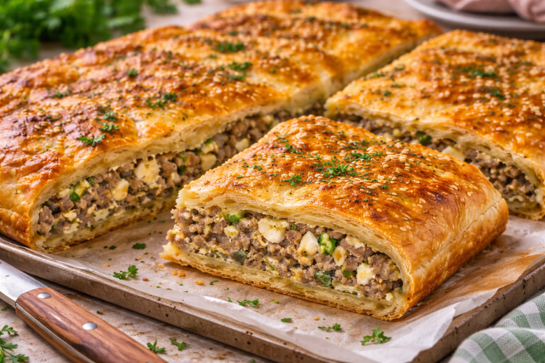 Греческий пирог — отличный вариант, когда хочется приготовить что-то эффектное, но без лишней возни. Хрустящее слоеное тесто, сочная мясная начинка и сразу два вида сыра делают вкус насыщенным и запоминающимся. Такой пирог хорош и для семейного ужина, и для гостей — исчезает со стола одним из первых.