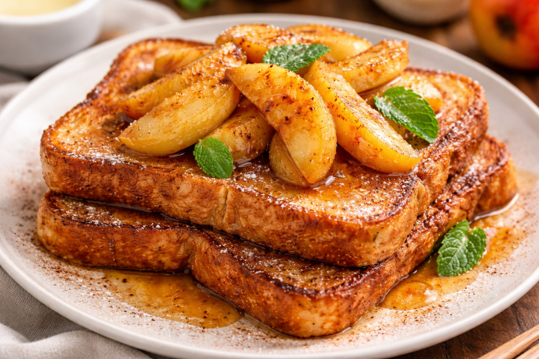 Эти гренки получаются особенно мягкими внутри и румяными снаружи — без капли молока. Вместо него я добавляю в яйца натуральный йогурт и щепотку корицы. Именно йогурт делает текстуру бархатной, а вкус — нежным и слегка сливочным. А сверху — жаренные на сливочном масле яблоки с легкой карамельной корочкой. Аромат на кухне стоит такой, будто вы в уютном кафе.