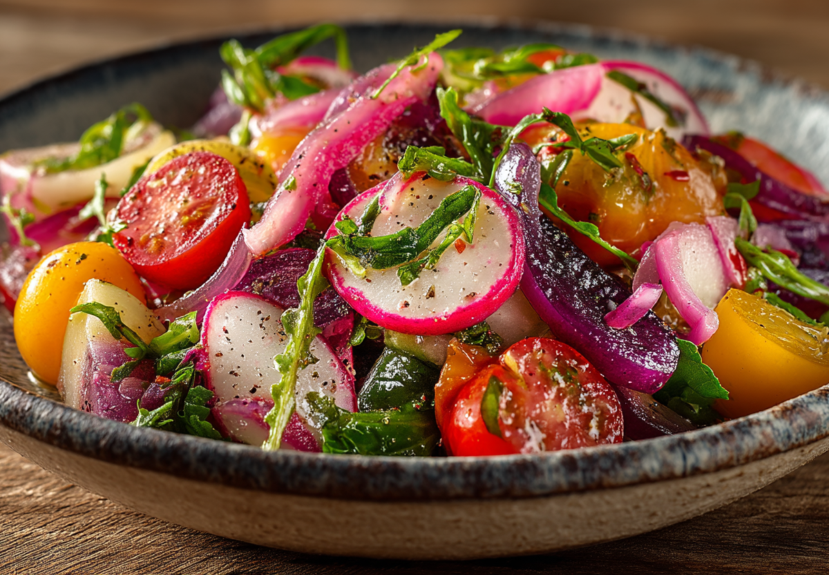 Когда на рынках появляется первый хрустящий редис и ароматные грунтовые помидоры, настает время для этого салата. Его гениальность — в простоте, которая позволяет ярким вкусам свежих овощей звучать в полную силу.