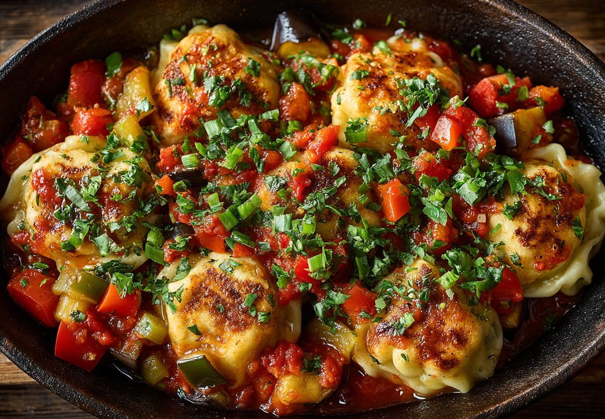 Вареники (любые, на ваш выбор) — 400–500 г, баклажан — 1 шт. (средний), смесь овощная замороженная (мексиканская) — 300 г, лук зеленый — 3-4 пера, масло оливковое — 2-3 ст. л., паприка копченая — 1 ч. л., тимьян сушеный — 0,5 ч. л., соль, перец черный молотый — по вкусу.