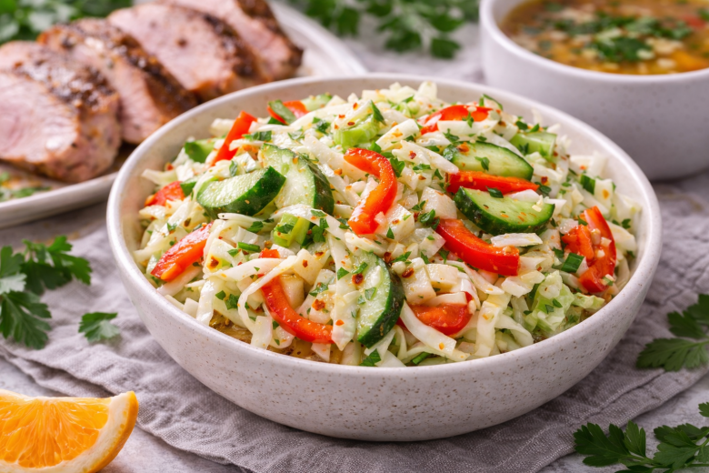 Приготовление: капусту тонко нашинкуйте, переложите в миску и слегка помните руками, чтобы она стала мягче и сочнее. Болгарский перец нарежьте тонкими полосками, свежие огурцы — соломкой или полукружьями, лук — мелкими кубиками. Соедините все овощи и хорошо перемешайте. Для заправки, если мед густой, слегка растопите его, добавьте соль и уксус, тщательно перемешайте. Влейте заправку к овощам, накройте миску крышкой и уберите в холодильник на 1–2 часа, чтобы салат настоялся. Перед подачей еще раз перемешайте, при необходимости скорректируйте соль и заправьте маслом. Салат получается сочным, освежающим и очень гармоничным — идеальный вариант на каждый день.