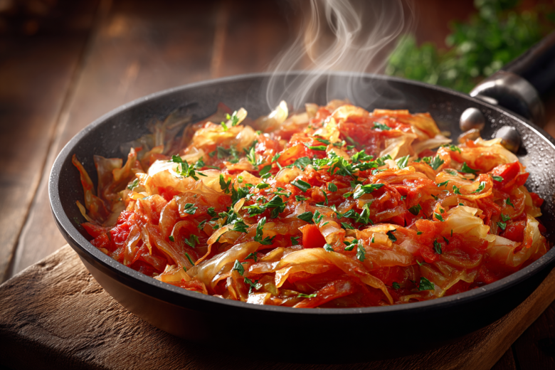 Беру белокочанную капусту, ароматные итальянские травы и сочные помидоры — и готовлю сытное постное блюдо прямо на сковороде. Это гениально простое и невероятно вкусное блюдо, идеальное для поста или легкого ужина. Его необычность в том, что обычная капуста в компании чеснока, орегано и базилика приобретает настоящий итальянский характер, а тушится все в одном сотейнике без лишних хлопот. Получается обалденная вкуснятина: мягкие, пропитанные томатным соком капустные ломтики с пикантными нотками чеснока и пряных трав. Блюдо настолько ароматное и насыщенное, что от тарелки невозможно оторваться, а готовится оно быстрее, чем вы сварите макароны.