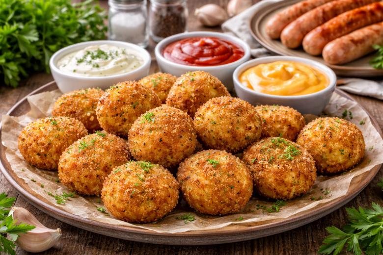 Картофель очищают, нарезают кусочками и отваривают в подсоленной воде до мягкости. Затем воду сливают и разминают в однородное пюре. В горячую массу добавляют тертый сыр, измельченный чеснок, соль, перец и крахмал, все тщательно перемешивают. Из картофельной массы формируют небольшие шарики, обваливают их в панировочных сухарях, чтобы получилась аппетитная корочка. В сковороде разогревают масло и обжаривают кругетсы с двух сторон до румяности и хруста. Получается невероятно ароматно, сытно и по-домашнему уютно — такая картошка нравится и детям, и взрослым.