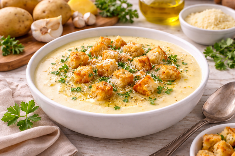 Ингредиенты: картофель — 4 шт., молоко — 1/4 стакана, сливки — 1/2 стакана, бульонный кубик — 1/2 шт., оливковое масло — по вкусу, соль и перец — по вкусу, вода — по необходимости, пармезан — для подачи, белый хлеб — 2–3 ломтика, чеснок — 1 зубчик, петрушка — по желанию.