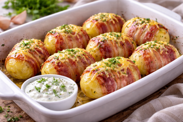 Приготовление: картофель отвариваем в подсоленной воде до полуготовности, сливаем воду и даём немного остыть. Каждую картофелину оборачиваем полоской бекона, выкладываем в форму для запекания, сверху посыпаем тёртым сыром. Запекаем картофель в беконе под сыром в духовке 20 минут при температуре 160–180 °C. Для соуса смешиваем сметану и майонез в одинаковых пропорциях, добавляем измельчённую зелень, чеснок и специи по вкусу. Подаём картофель горячим с соусом.