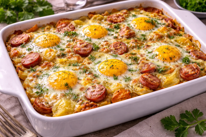 Как готовлю: картофель очищаю, нарезаю тонкими кружочками и отвариваю в кипящей подсоленной воде 5–7 минут до полуготовности. Сосиски режу колечками, сыр натираю на крупной терке. Для соуса растапливаю сливочное масло, добавляю муку и быстро размешиваю. Вливаю молоко, постоянно помешивая, пока соус не станет гладким и слегка густым. Добавляю соль, перец и мелко нарезанную зелень. В форму для запекания выкладываю картофель, затем сосиски, заливаю соусом. Сверху аккуратно разбиваю яйца и посыпаю тертым сыром. Запекаю при 180 °C около 25–30 минут, пока сверху не появится золотистая корочка.