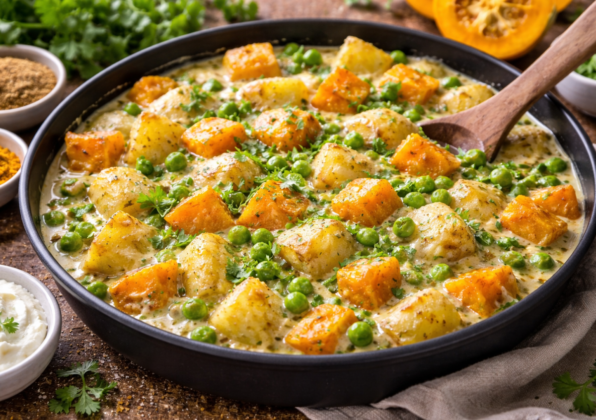 Картофель — 2 шт., тыква — 400 г, зелёный горошек замороженный — 300 г, сметана — 200 г, асафетида — щепотка, кориандр — по вкусу, чёрный перец — по вкусу, соль — по вкусу.