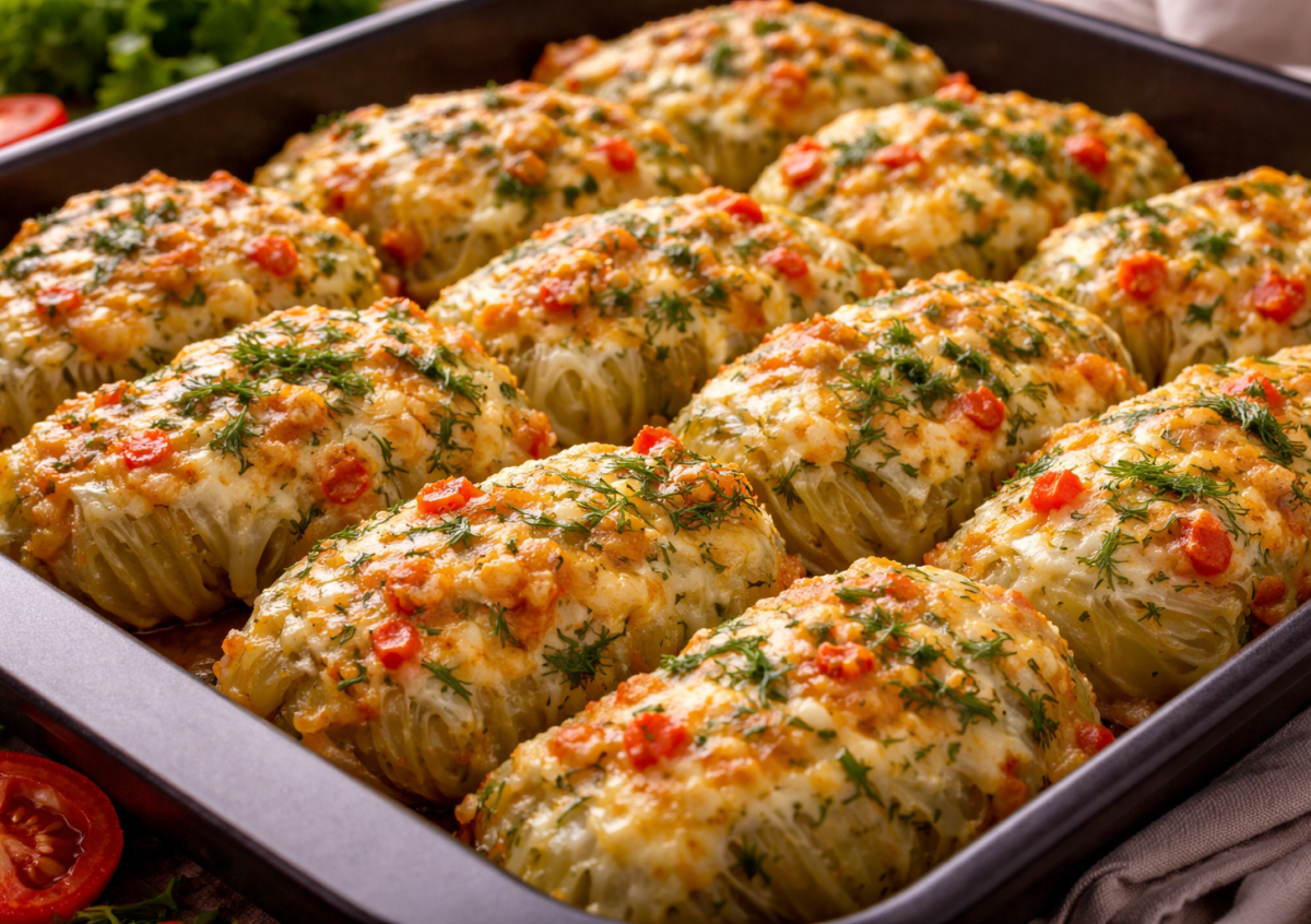 Этот вариант — настоящая находка для домашнего ужина. Нежные голубцы с сочной начинкой из фарша, риса и овощей сверху покрываются аппетитной шубкой из сыра, зелени и томатов. Во время запекания все пропитывается ароматами, а сверху образуется румяная, слегка хрустящая корочка.