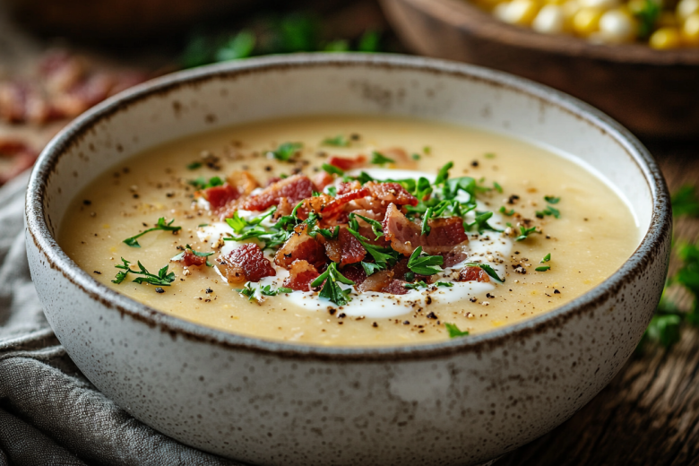 Яркий, солнечный цвет и невероятно нежная, бархатистая текстура — вот что отличает этот крем-суп. Консервированная кукуруза придает ему природную сладость и насыщенный вкус, картофель и морковь делают его сытным, а сливки доводят консистенцию до совершенства. А хрустящие ломтики бекона сверху создают идеальный соленый контраст и превращают простой обед в маленький кулинарный праздник.