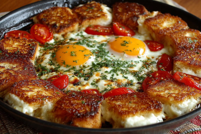 Для приготовления понадобится: 4-5 ломтиков батона, 2–3 яйца, 50 г твердого сыра, 1 небольшой помидор, соль, черный перец, паприка. Разогрейте сковороду на среднем огне и смажьте маслом. Булку нарежьте на крупные кубики и выложите их по краю сковороды, формируя круг. Между ломтиками хлеба и в центр положите нарезанные кубиками или ломтиками сыр. Помидор нарежьте кубиками и выложите в центр сковороды поверх сыра. Аккуратно разбейте яйца в центр, стараясь не повредить желтки. Посолите, поперчите, посыпьте специями. Накройте сковороду крышкой и готовьте на среднем огне 5–7 минут, пока белок яиц не схватится, сыр не расплавится, а хлеб снизу не подрумянится. Подавайте сразу же, прямо в сковороде.