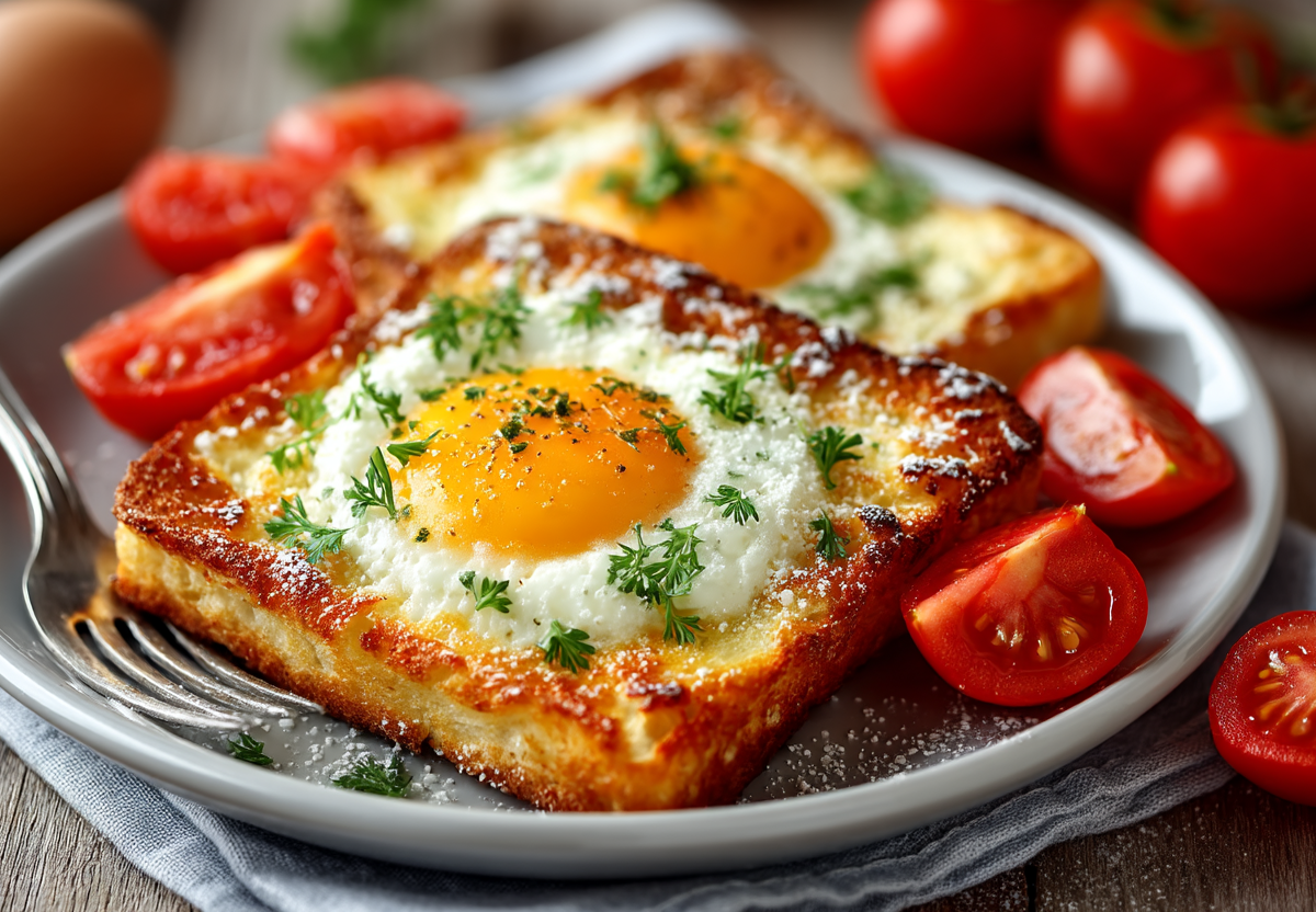 Тосты с яйцом — это идеальный завтрак, когда времени в обрез, а накормить семью нужно вкусно и сытно. Хрустящий обжаренный хлеб, яйцо с жидким желтком, помидор и расплавленный сыр создают идеальное сочетание.