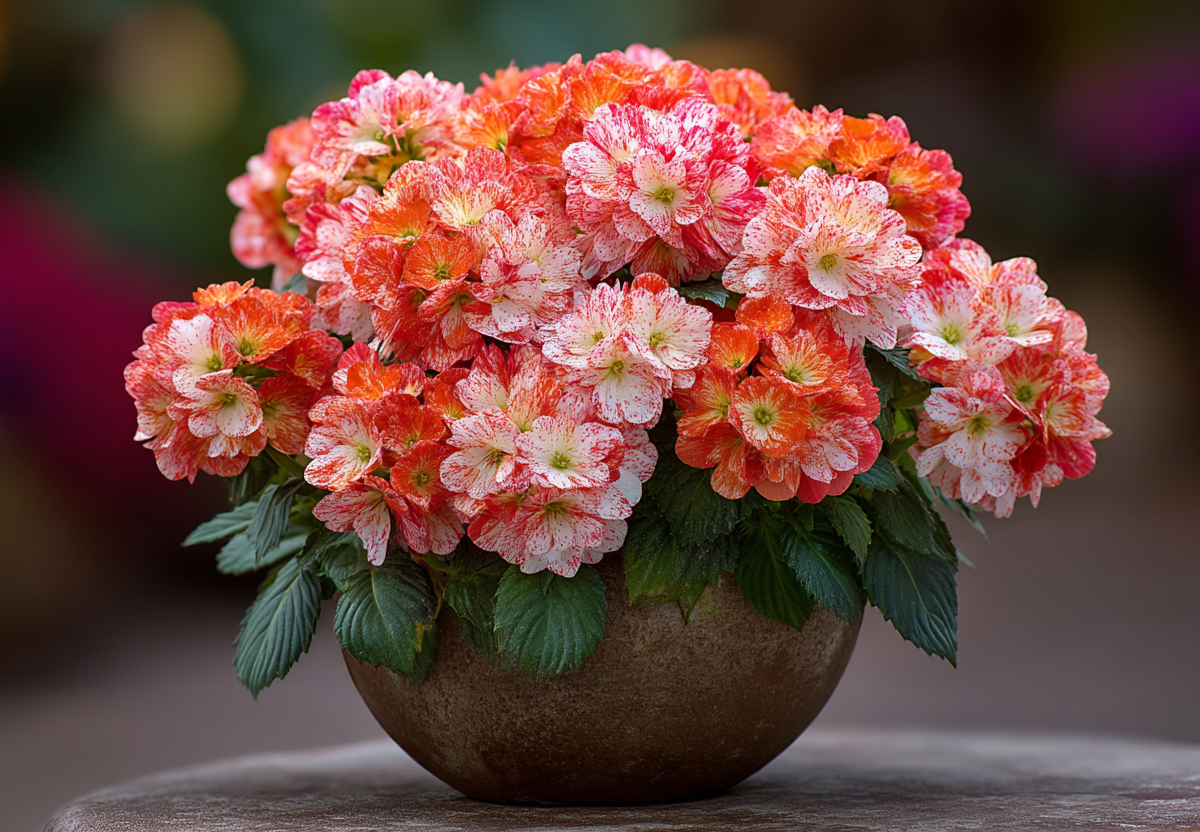 Бальзамин «Афина оранжевая вспышка» — это растение, которое способно превратить самый тенистый уголок в праздничный фейерверк ярких, сочных красок. Представьте себе: компактные, сильноветвящиеся кустики высотой 20–30 см, усыпанные множеством крупных, до 5 см в диаметре, махровых цветков. Лепестки этого гибрида имеют уникальную окраску: белую или нежно-лососевую основу, по которой яркими, шалфейно-оранжевыми брызгами и мазками будто бы рассыпаны пятна и штрихи, создавая эффект «флеша» — вспышки (Orange Flash). Эта особенность и дала название сорту, делая каждое соцветие неповторимым, словно отпечаток пальца.