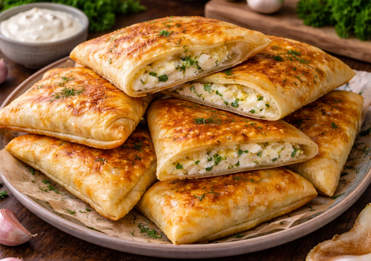 Золотистые, румяные конвертики с сочной начинкой из творога и сыра — простое блюдо, которое получается невероятно вкусным. Тонкое тесто становится слегка слоистым, а внутри — нежная, ароматная начинка с зеленью, которая буквально тает во рту.