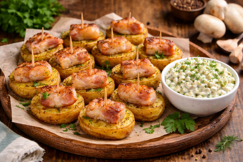 Эта простая закуска из картофеля и сала выглядит эффектно и готовится без лишних хлопот. Румяные «кораблики» получаются сочными внутри и с хрустящей корочкой снаружи. А освежающий огуречный соус идеально дополняет насыщенный вкус запеченного картофеля и специй.