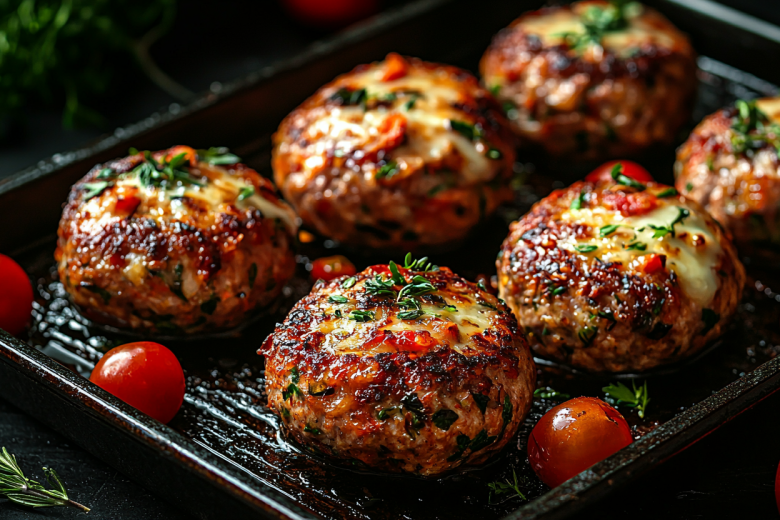 Выкладываю биточки швом вниз в форму для запекания. Ставлю в разогретую до 200 °C духовку на 15–20 минут. Затем достаю, посыпаю каждый биточек тертым сыром и возвращаю в духовку еще на 5–7 минут, пока сыр не расплавится и не подрумянится.