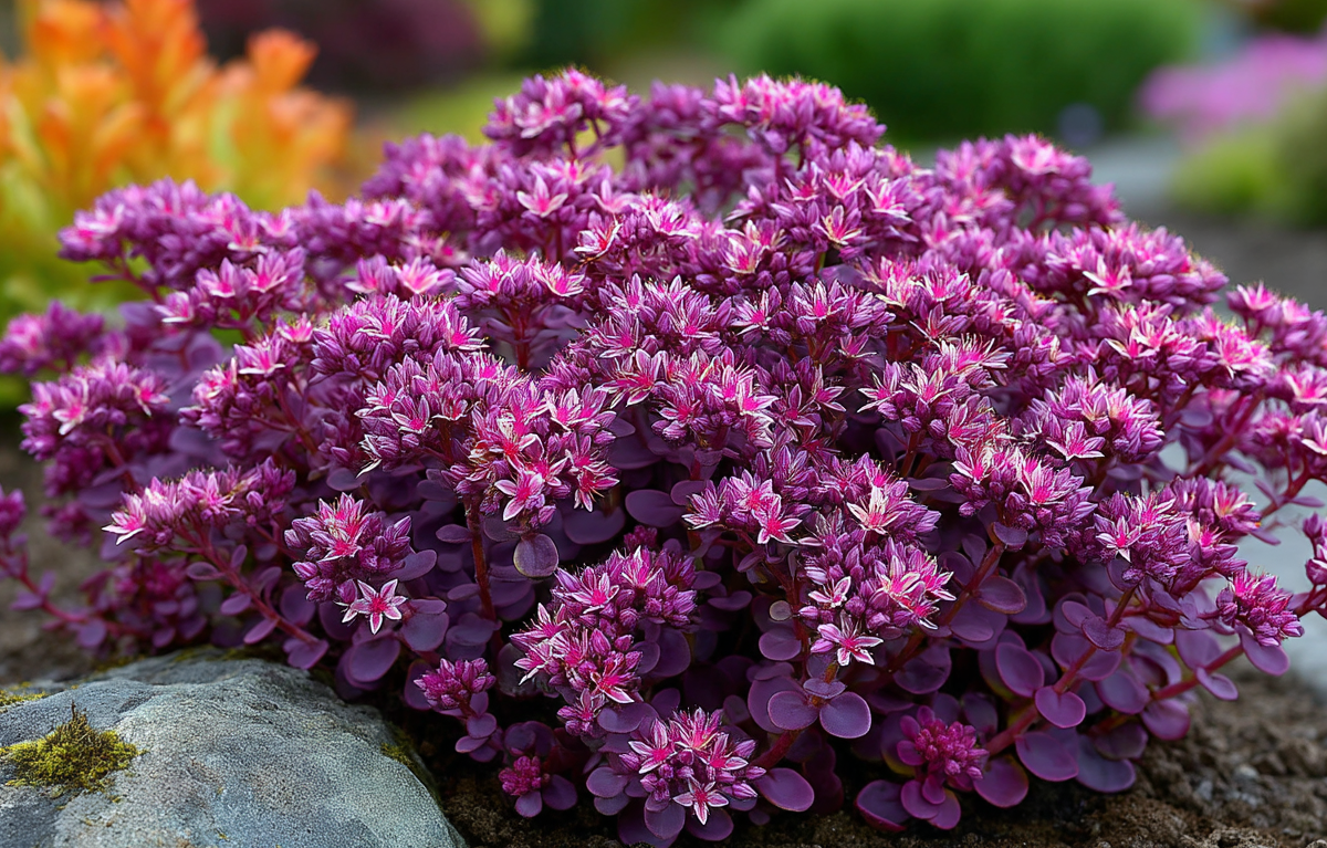 Седум «пурпуреум» — этот многолетник представляет собой низкорослое почвопокровное растение высотой 10–15 см, способное создавать на участке плотные яркие ковры из пурпурных листьев и розовых звездочек.