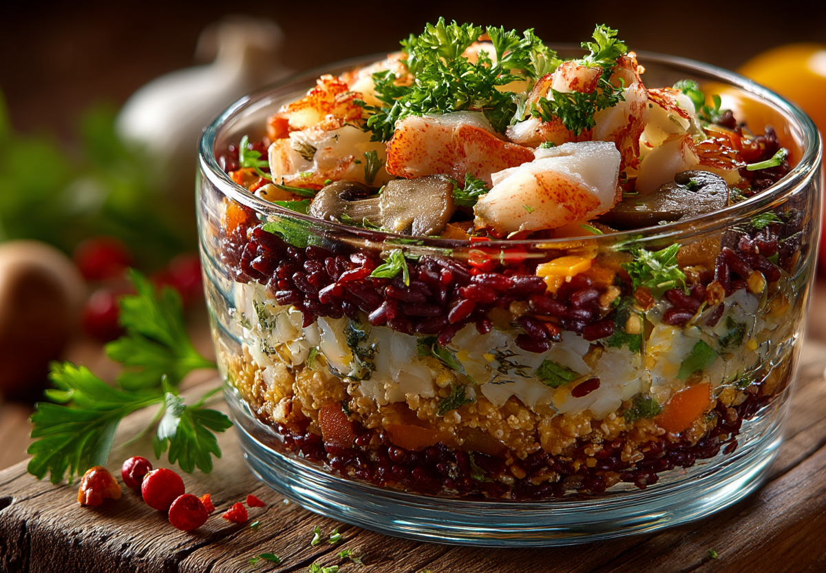 Крабовый салат обретает новое звучание с красным рисом. Эта крупа не просто меняет цвет блюда — она придает ему благородный ореховый оттенок и делает композицию более сытной.
