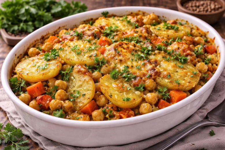 Как-то я неожиданно купила банку консервированного нута, и получилась суперзапеканка. Эта ароматная картофельная запеканка вдохновлена южноиндийской кухней, но готовится максимально просто. Консервированный нут экономит время, а специи превращают привычные овощи в яркое и сытное блюдо. Запеканка хороша и как самостоятельный ужин, и как необычный гарнир.