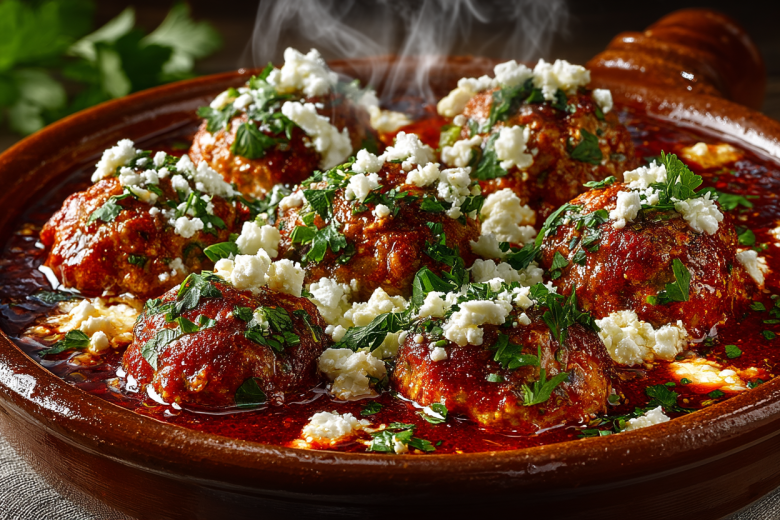 Фета здесь — не просто добавка, а секретный агент, работающий изнутри. Пока фрикадельки запекаются в томатном соусе, сыр не плавится в лужицу, а остается в виде нежных, солоноватых творожистых островков. Каждый укус — это лотерея: попадется ли вам кусочек оливки, перчинка или эта кремовая вспышка феты, разрезающая легкость курицы.