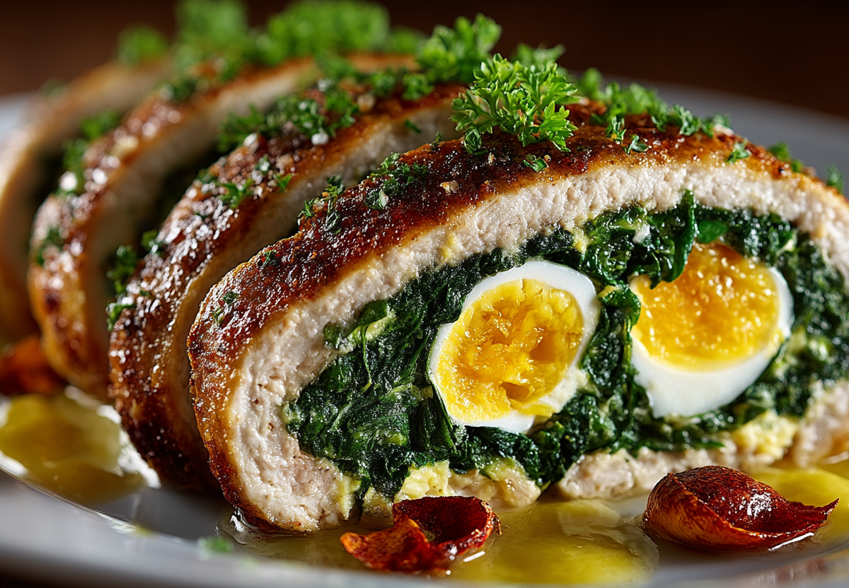 Отварите 8 яиц, бланшируйте шпинат. В фарш добавьте лук, размоченный хлеб, яйцо и специи. Филе отбейте тонко, выложите в форму. Сверху — фарш, затем яйца, обернутые шпинатом, снова фарш, накройте отбивными. Запекайте при 180 °С 1 час 45 минут (первый час под фольгой). Остудите, украсьте тертым яйцом. Этот рулет станет главной звездой стола.
