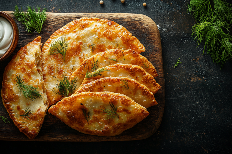 700–800 г картофеля очищаю, отвариваю до мягкости в подсоленной воде, затем сливаю воду и разминаю в пюре. 1 луковицу мелко нарезаю и обжариваю на растительном масле до золотистого цвета. Смешиваю теплое картофельное пюре, обжаренный лук, 100 г натертого сыра и мелко порубленную зелень (укроп, петрушка). Солю по вкусу. Для теста в миске смешиваю 2 стакана муки (около 320 г), 1 ч. л. соли, 2 яйца и 1 стакан кефира. Замешиваю мягкое, нелипкое тесто. Разделяю тесто на небольшие шарики. Каждый шарик раскатываю в круглую лепешку. В центр выкладываю столовую ложку картофельной начинки. Края теста защипываю, как у обычного пирожка, а затем аккуратно придавливаю его ладонью с обеих сторон, формируя плоскую лепешку-«лапоть». Разогреваю на сковороде растительное масло. Обжариваю пирожки на среднем огне по 3–4 минуты с каждой стороны до красивой золотисто-коричневой корочки. Выкладываю на бумажное полотенце, чтобы убрать излишки масла. Подаю теплыми.