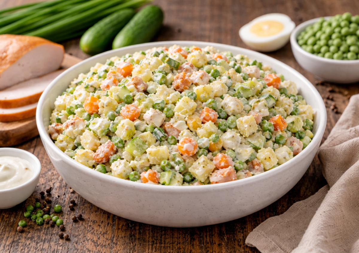 Салат оливье с копченой куриной грудкой — свежий, ароматный и неожиданно легкий. Такой вариант исчезает со стола первым, а гости долго не могут понять, в чем секрет вкуса! Здесь нет тяжелого майонеза — только нежная йогуртовая заправка с вареным желтком, которая делает салат одновременно насыщенным и воздушным.