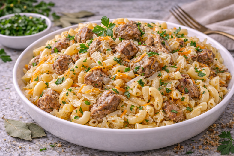 Приготовление: мясо нарезают небольшими кусочками и обжаривают на растительном масле до румяной корочки, затем добавляют мелко нарезанный лук и тертую морковь, жарят до мягкости. Капусту тонко шинкуют, отправляют к мясу с овощами, солят, кладут лавровый лист и тушат под крышкой до мягкости капусты. Отдельно отваривают макароны до готовности, затем перекладывают их в сковороду с мясом и капустой, аккуратно перемешивают и прогревают все вместе пару минут. Перед подачей посыпают свежей зеленью.