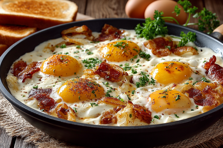 Для приготовления понадобится: 200 г копченой или сырой грудинки (можно взять бекон), 1 крупная луковица, 4 яйца, 200 г сметаны (20-25%), соль, черный перец.
