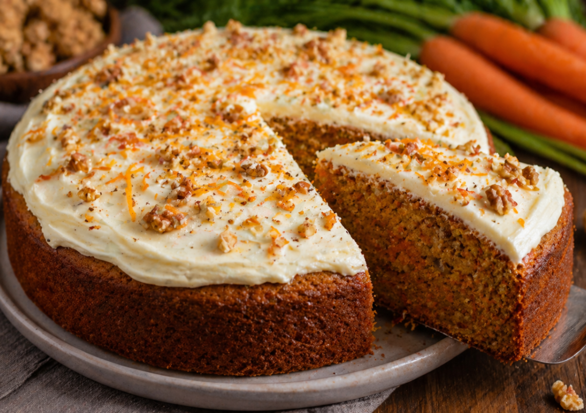Яйца взбиваю с сахаром до пышной светлой массы, добавляю растопленное сливочное масло, морковь, орехи и специи. Всыпаю просеянную муку с разрыхлителем и аккуратно перемешиваю до однородного теста. Перекладываю в форму (примерно 20 см) и выпекаю при 180 °C около 40–45 минут до готовности. Даю полностью остыть.