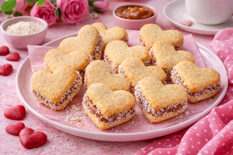 Приготовление: размягчённое масло взбейте с желтками до пышной массы. Добавьте сахар, соль и ванилин, перемешайте. Влейте горячее молоко тонкой струйкой, продолжая взбивать. Вмешайте крахмал, разрыхлитель и просеянную муку, замесите мягкое тесто. Раскатайте тесто толщиной около 5 мм и вырежьте сердечки формочкой. Выложите заготовки на противень с пергаментом выпекайте при 180 °C около 10 минут до лёгкой румяности. Остывшее печенье смажьте варёной сгущёнкой, соедините попарно. Края обмакните в кокосовую стружку.