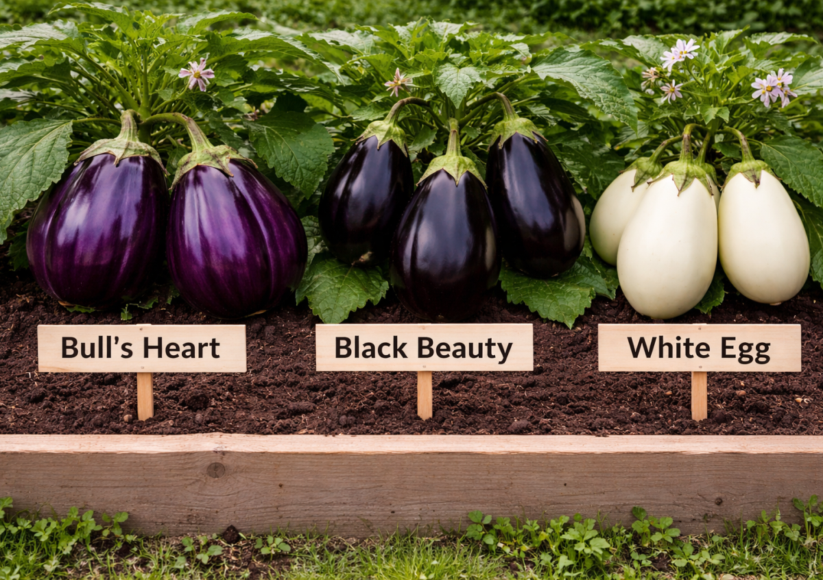 Еще один интересный вариант — «белое яйцо». Этот сорт отличается необычным светлым цветом плодов и мягким, деликатным вкусом без горечи, отлично подходит для запекания и жарки.