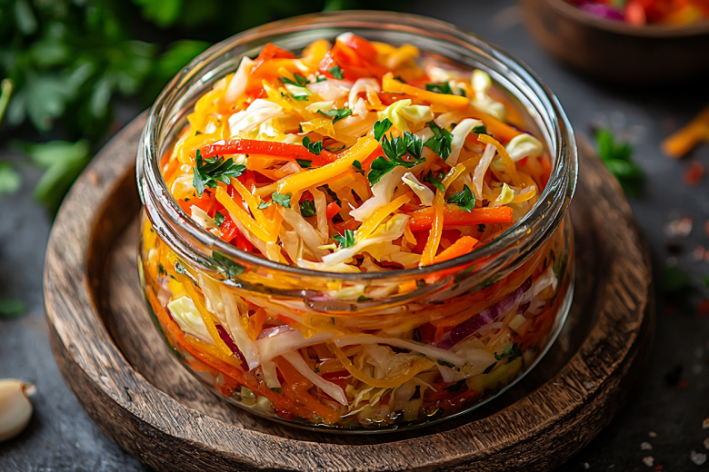 Вам понадобится: 300 г белокочанной капусты, 1 свежий огурец, 1 сладкий перец, 100 г редьки, 1 средняя морковь. Для заправки: 4–5 ст. л. растительного масла, 2–3 зубчика чеснока (продавить), 1 ч. л. паприки, 1/2 ч. л. молотого кориандра, щепотка молотого красного перца (по желанию), 1 ст. л. яблочного или винного уксуса, 1 ч. л. сахара, соль по вкусу. Капусту тонко нашинкуйте, огурец, перец и редьку нарежьте соломкой, морковь натрите на крупной терке. Подготовленные овощи сложите в большую миску, но пока не солите. На сковороде разогрейте масло, добавьте чеснок и все специи, прогрейте 30 секунд на среднем огне, не давая чесноку подгореть. Снимите с огня, сразу влейте уксус, добавьте сахар и соль, перемешайте. Горячую заправку немедленно вылейте на овощи в миске. Тщательно все перемешайте, чтобы масло равномерно распределилось. Дайте салату постоять 15–20 минут для пропитки.