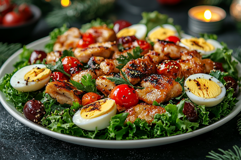 Вкус получается бесподобным и сбалансированным: нежная курица, сладкая карамельная груша, свежие хрустящие листья, сливочные яйца и сочные томаты объединяются пикантной чесночно-горчичной заправкой с кислинкой.