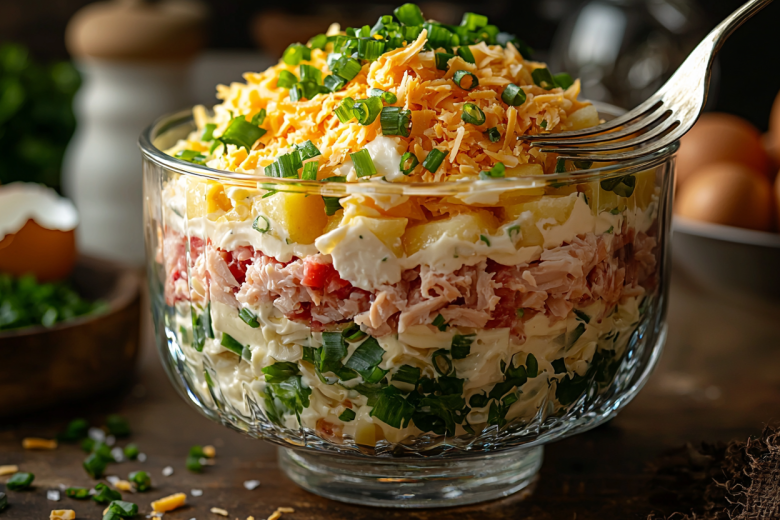 Его вкус поражает гармонией: картофель создает мягкую основу, тунец добавляет насыщенную морскую нотку, белки дают упругую текстуру, крабовые палочки — легкую сладость и яркий акцент, а желтки завершают композицию нежной, бархатистой крошкой.