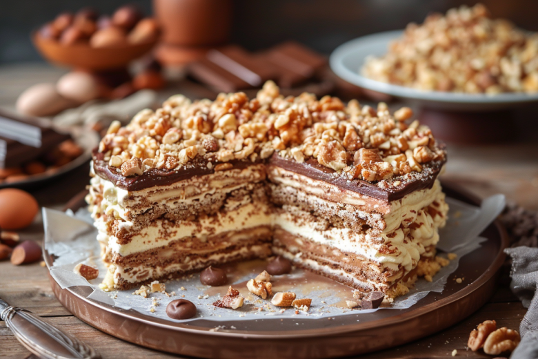 Этот торт — гимн изысканной простоте и насыщенному вкусу. Воздушные, хрустящие коржи из орехового безе, по структуре напоминающие меренгу, в сочетании с бархатистым, интенсивным шоколадным кремом создают невероятную игру текстур и глубину. Он настолько легкий и одновременно богатый, что классический «Киевский» рядом с ним кажется просто тренировкой перед настоящим кулинарным шедевром, который при этом готовится из минимального набора продуктов.