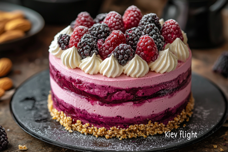 Этот торт — полная противоположность плотному, маслянистому «Киевскому». Его философия — легкость и игра контрастных текстур: облака безе, тающий ягодный мусс и «осколки» хрустящего орехового пралине создают ощущение невесомости и изысканности. Каждый слой существует отдельно, но вместе они образуют идеальную гармонию, где нет места тяжести, а есть только полет вкуса.
