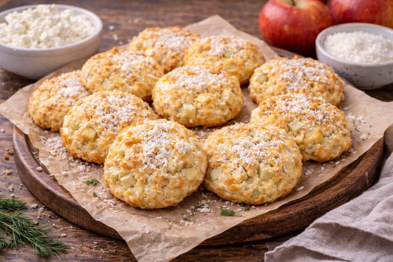 Приготовление: творог разомните вилкой или пробейте блендером до гладкости. Добавьте яйцо, мягкое сливочное масло и подсластитель, хорошо перемешайте. Всыпьте просеянную муку с разрыхлителем и кокосовую стружку, замесите мягкое, приятное тесто. Яблоки нарежьте мелкими кубиками и аккуратно вмешайте в тесто. Сформируйте небольшие коржики, выложите их на противень с пергаментом. Выпекайте в разогретой до 180 °C духовке 20–25 минут до легкой золотистой корочки. Подавайте теплыми или полностью остывшими — они остаются мягкими и ароматными.