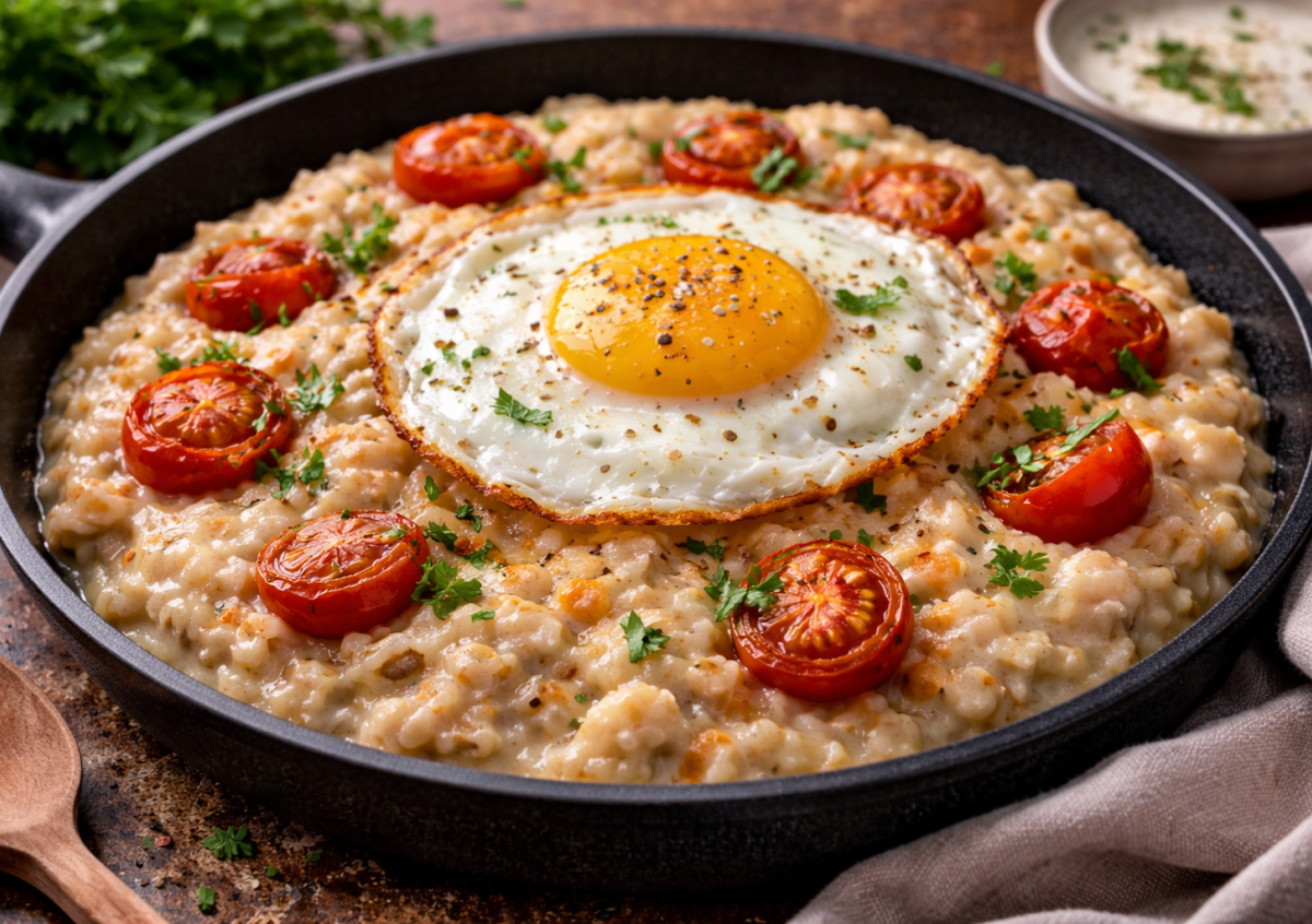 Если обычная овсянка уже надоела, попробуйте этот несладкий вариант с яйцом и сыром — он совсем не похож на привычную кашу. Получается сытное кремовое блюдо с насыщенным вкусом, которое легко заменяет полноценный завтрак или даже ужин. А жареное яйцо сверху делает его еще более аппетитным и «ресторанным».