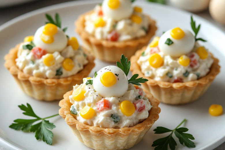 Эта изысканная закуска станет настоящей жемчужиной вашего праздничного стола, сочетая в себе хрустящую основу, нежнейшую сливочную начинку и элегантную подачу. Каждая тарталетка подобна драгоценному ларцу, наполненному легким салатом с яркими акцентами сладкой кукурузы и зелени, а украшение из перепелиных яиц придает блюду завершенный и праздничный вид. Это идеальное решение для фуршета или торжественного ужина, когда важно удивить гостей и красотой, и вкусом.