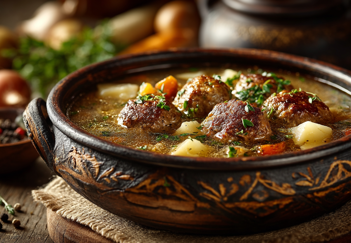 Этот суп — не просто обед, а кулинарная традиция, уходящая корнями в историю Западной Европы. Подаваемый после долгого поста, он символизировал возвращение к сытной пище. Густой бульон с томленой говядиной и нежнейшими печеночными клецками согревает и насыщает по-настоящему.