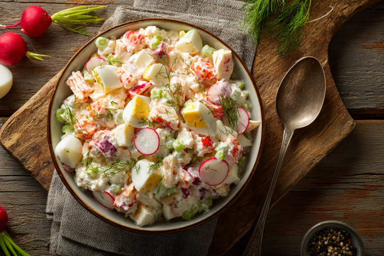 Для начала отварите яйца вкрутую, затем остудите их в холодной воде и очистите. Нарежьте небольшими кубиками и переложите в глубокую миску. Крабовые палочки также нарежьте кусочками — лучше брать качественный продукт, ведь именно он задает основной вкус салата.