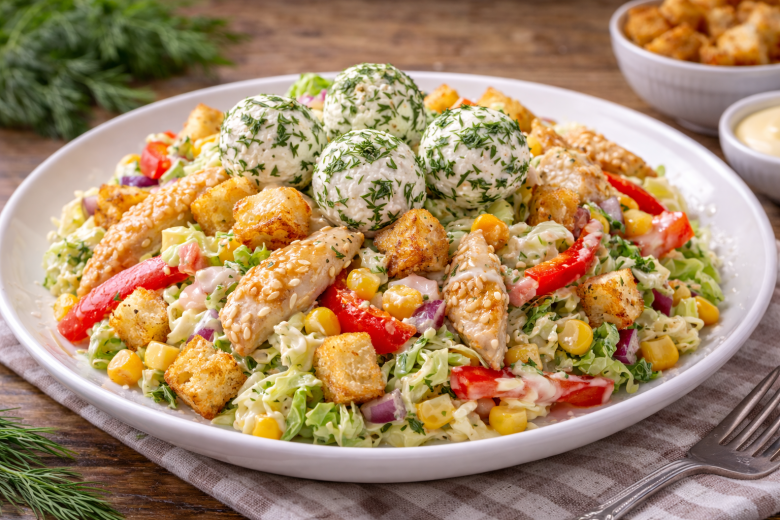 Приготовление: батон нарезают кубиками, смешивают с маслом, чесноком и травами, запекают при 160–170 °C 15–20 минут до хруста. Куриное филе нарезают полосками, солят, перчат, посыпают кунжутом и обжаривают на сильном огне 5–7 минут до сочности. Капусту шинкуют, перец нарезают соломкой, лук мелко режут. Для шариков сыр смешивают с чесноком, укропом и базиликом, формируют небольшие шарики. Для заправки соединяют майонез, соевый соус, чеснок и мандариновый сок. В миске смешивают овощи, кукурузу и курицу, выкладывают на тарелку, сверху добавляют сырные шарики и крутоны, поливают соусом.