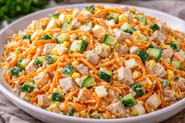 Иногда хочется салата, который получается вкусным без сложных ингредиентов и долгой готовки. «Пятерочка» — именно такой вариант. В нем сочетаются нежная курица, хрустящие огурцы, пикантная морковь по-корейски и немного сыра.