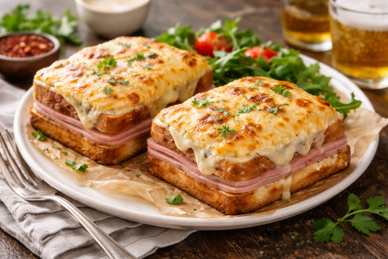 Сначала готовим соус бешамель: растапливаем сливочное масло, добавляем муку и быстро размешиваем, затем тонкой струйкой вливаем молоко, помешивая до густоты, приправляем солью, перцем и мускатным орехом. Ломтики хлеба слегка подсушиваем, один слой смазываем соусом, выкладываем ветчину и тертый сыр, накрываем вторым ломтиком. Сверху еще немного соуса и сыра. Запекаем в духовке при 190 °C 8–10 минут до румяной корочки и подаем сразу — пока сыр тянется, а хлеб приятно хрустит.