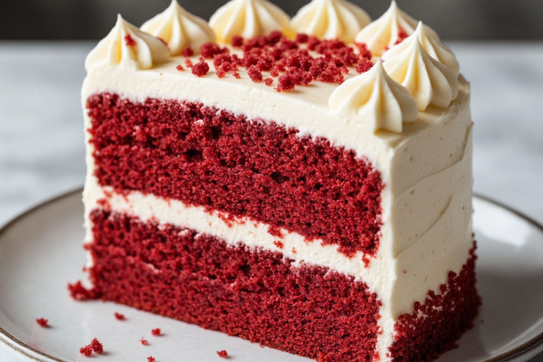 Для приготовления вам понадобится: для бисквита: 4 яйца, 300 г сахара, 300 г муки, 250 мл кефира, 150 мл рафинированного масла, 2 ст. л. какао, 1 ч. л. соды, 1 ст. л. уксуса, 1–2 ч. л. красного пищевого красителя (гелевого), щепотка соли. Для крема: 600 г творожного сыра (типа филадельфия), 300 г сливочного масла, 250 г сахарной пудры, ванильный экстракт. Яйца взбейте с сахаром до пышности. Добавьте кефир, масло, краситель. Просеянную муку смешайте с какао и солью, введите в жидкую смесь. Погасите соду уксусом и добавьте в тесто. Разделите тесто по двум формам и выпекайте при 180 °C 30–35 минут. Остудите и разрежьте каждый корж пополам. Для крема взбейте мягкое масло с сахарной пудрой, добавьте сыр и ваниль, взбивайте до гладкости. Промажьте коржи кремом, соберите торт. Дайте ему пропитаться в холодильнике не менее 8 часов. Украсьте крошкой из обрезков коржей или белым шоколадом.