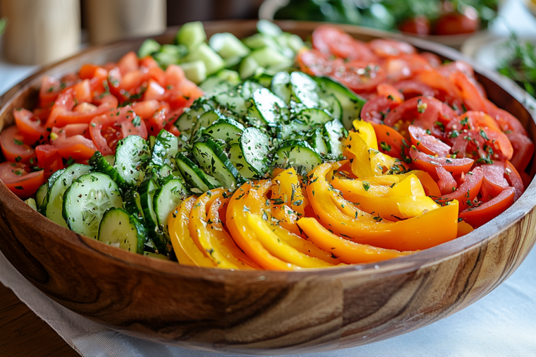 Вкус этого салата — настоящий фейерверк: сочная хрустящая свежесть сладких перцев, огурцов и помидоров встречается с пикантной, острой и сладковатой ноткой моркови по-корейски, а капля острой аджики добавляет согревающий, бодрящий акцент, идеально сбалансированный без тяжести майонеза.